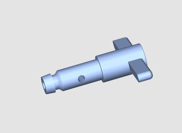 可以肯定,二個滑塊在分開時,產品是會粘在定模滑塊2 上的,并且會隨著滑塊2一起拉扯,由于產品中間有動模芯掛住,產品一定會拉傷,因為定模滑塊2一側的造型的特征,內外的型面都在一側,而滑塊針是不允許有脫膜斜度的(因為是裝配旋閥的),包緊力很大,這也是以前的模具多次失敗的主要原因。所以我在定模滑塊2一側設置了止推裝置,首先,有一個推管,在滑塊分開時,它是不動的,頂住產品,將產品強制性地留在中間,見下圖。