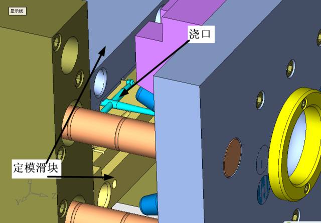 怎樣在模具結構的設計方面避免模芯的漂移和彈性變形?怎樣避免在定模滑塊外移時制品不跟著滑塊向一邊跑?進膠形式怎么安排,是本案例的關鍵。通過思考和推理,模具的總結構應該是這樣的,見下圖