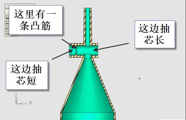 這個產品幾何形狀不是很復雜,但是模具結構很復雜,主要是難以控制定模凹腔與動模型芯的同心度,還有定模抽芯時產品受滑塊的拉扯產生的變形,并且產品會吸附在滑塊上。從圖中可以看到,產品的小頭有個小圓管,是用來裝旋閥的位置,剖視圖中可以看到,模具的型芯是一邊長一邊短的,產品肯定會依附在型芯長的一邊的滑塊上。從產品的總體看,大端的圓筒狀的部分很難控制產品的壁厚均勻度