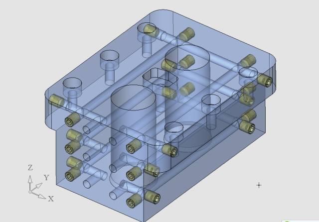 定模仁的設計是非常傳統的,沒有什么特殊的地方,從上圖可以看到,有分成三層的冷卻水路。因為我考慮到該制品的特征,產品與另外一個零件(旋閥)之間的配合是要求不漏水的,產品的圓度要求比較高,所以首先要保證模具溫度非常穩定,然后再考慮怎樣將制品定型。定模仁的型腔加工要與二個大滑塊定位在一起,然后才可以加工。最終的拋光也要將定模仁與二個定模滑塊定位在一起,不然很難保證結合線不錯位。