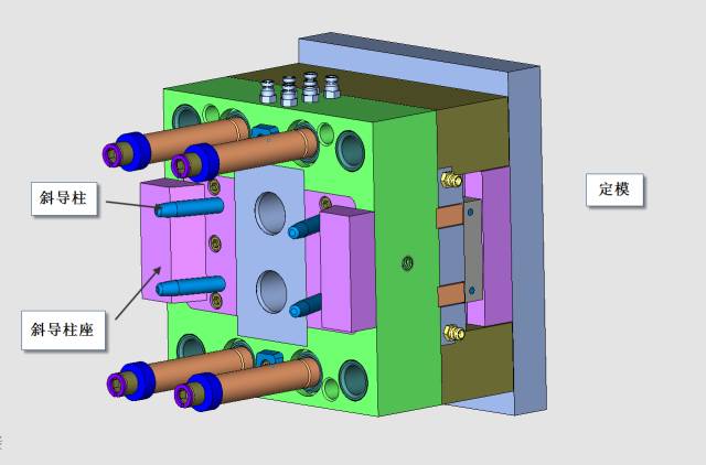 一般的模具設計師在滑塊的外側都是采用斜面,但是我在這里留了一點點平面,這樣做的好處是沒有增加加工成本,但是有了這個平面,火花機加工的時候非常方便,另外水接頭可以做在這個平面上,避免了在斜面上攻螺紋的麻煩。滑塊撥開的動力是靠固定在定模一側的斜導柱作上的斜導柱來實現的,見下圖。