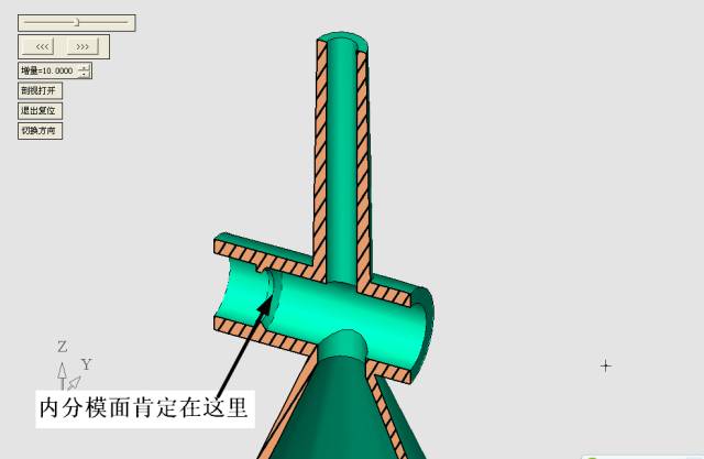 定模滑塊是這樣分型的,外分模線肯定在中間,內分模面一定是在型芯的臺階處。見下圖。