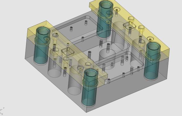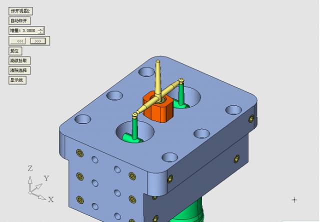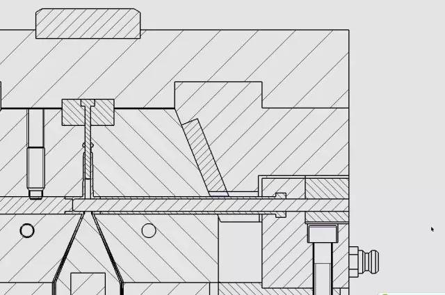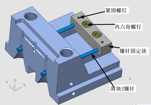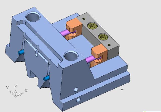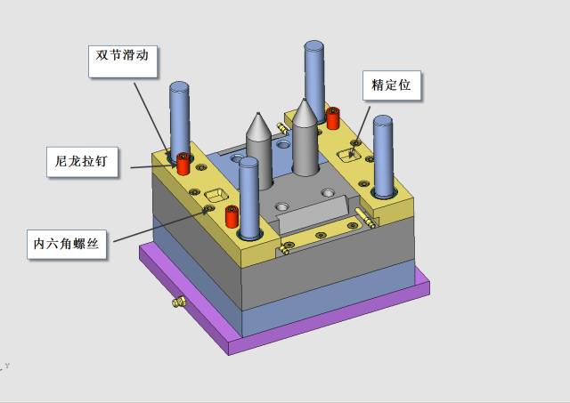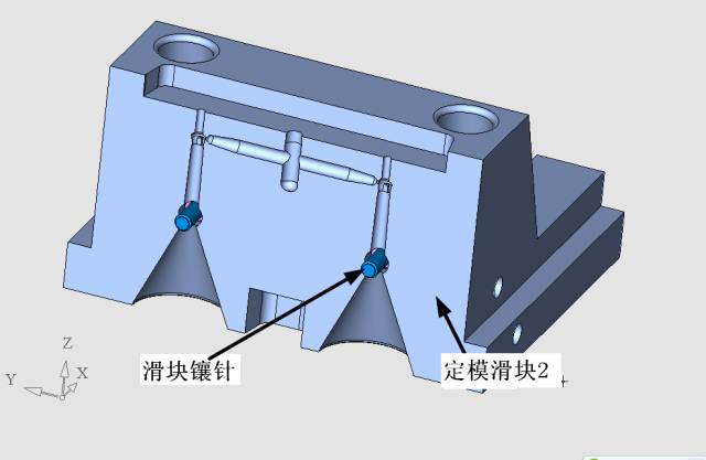 這個定位機構我是這樣設計的,非常簡單的結構,但是它起到了定模滑塊與定模仁的精確定位作用,同時也使得定模滑塊1、定模滑塊2之間產生精確定位,見下圖。