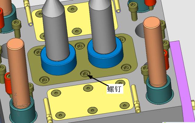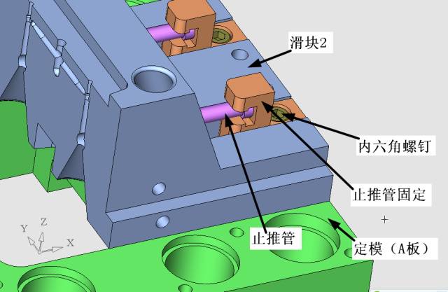 圖中,止推管是固定在定模上的,相對于產品是不動的。而滑塊2 鑲針是固定在滑塊2 上的,是隨著滑塊2 運動的。這樣就可以有效地防止產品在脫模時隨滑塊2運動。導致制品被拉傷。滑塊2 上的止推管是這樣固定的,見下圖。
