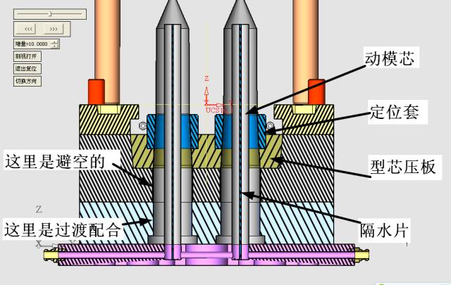 在上圖中我們可以看到,模芯的固定部分比成型部分長,根據我的經驗,此類模具一定要達到如此的比例(不能小于1:1),否則動模芯容易被熔融的塑料沖偏。動模芯內部是通冷卻水的,利用隔水片從動模底板中進出水。