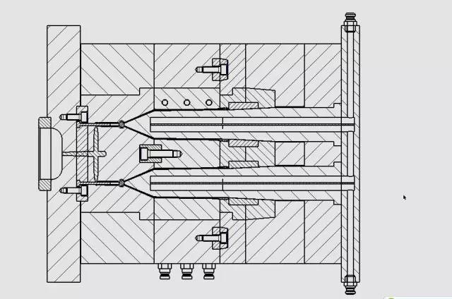 這個零件的澆口設置有點特殊性,不同于其他“試管”類的模具,因為在產品的尾部的通孔直徑很小,根本談不上剛性,經熔融的塑料流一沖就偏了。所以我采用了一種特別的澆口,是“爪形”澆口的變種,見下圖。